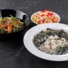Легкий японский супчик на бульоне из лосося с кокосовым молоком, водоросли вакаме и нежный тофу. Вес 300 мл. Японский рис пассированный с овощами и яйцом в кисло-сладком соусе и жаренной курочкой маринованной в остром соусе. Вес 200гр. Витаминный салат с пекинской капустой, морковью, снежным крабом и икрой массаго. Вес 75 гр.