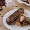 Пирожное из нежного заварного теста с шоколадным сливочно-сырным кремом, декорированное шоколадной глазурью