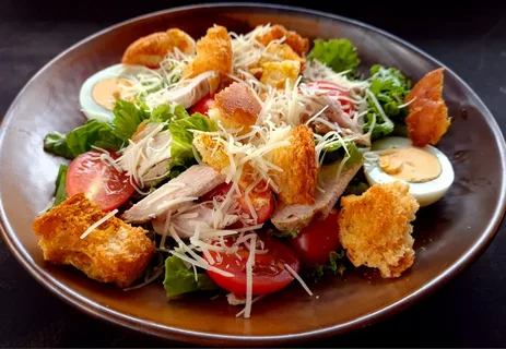 Ищете лёгкий и вкусный салат? Предлагаем вам попробовать это блюдо. Нежный салат айсберг, куриная грудка, аппетитные помидорки черри, перепелиные яйца, сыр пармезан, хрустящие гренки и, конечно же, фирменный соус Цезарь — всё это создаёт неповторимую гармонию вкусов