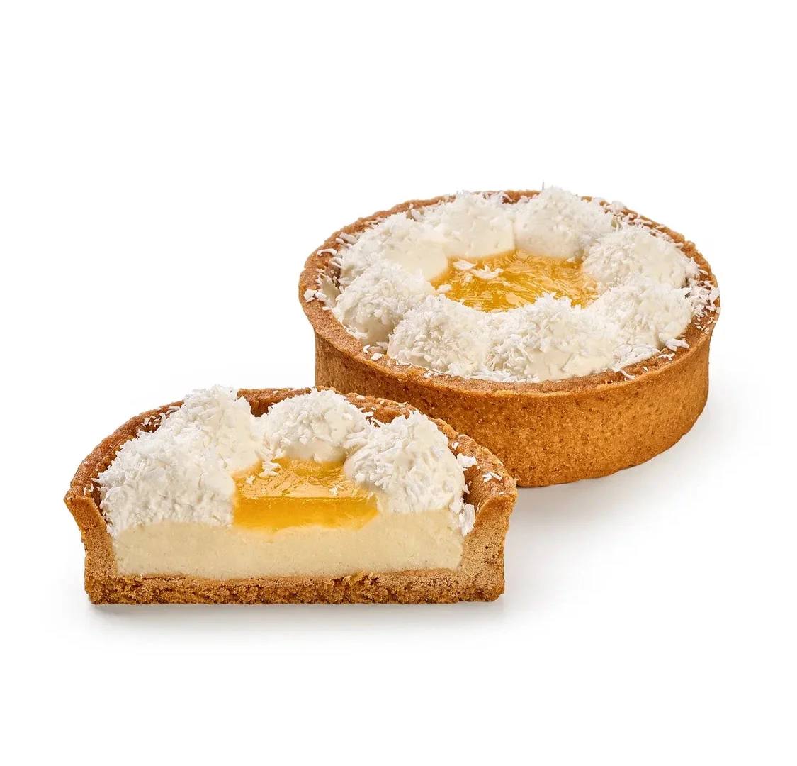 Песочная основа с легким заварным лимонным и сливочно-сырным кремом, декорированная кокосовой стружкой.